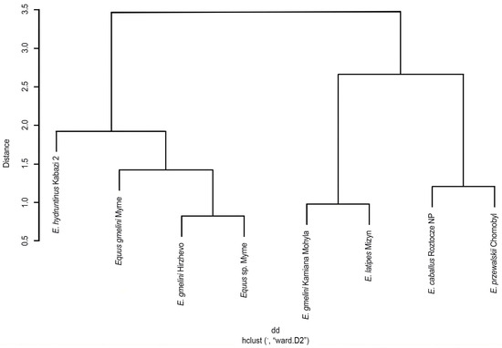 To further investigate the Kruskal–Wallis test results, Nemenyi’s test was conducted to assess pairwise comparisons. The obtained findings revealed significant differences among various species. Notably, E. gmelini specimens from Kamiana Mohyla exhibited distinct variations when compared to E. hydruntinus and other E. gmelini. Furthermore, notable interactions were observed between E. przewalskii and E. hydruntinus, as well as between E. gmelini from Myrne and E. latipes from Mizyn. Remarkably, E. caballus specimens from Roztocze NP displayed significant distinctions when compared to E. latipes from Mizyn and E. hydruntinus. Interestingly, the only two species that did not exhibit significant differences from E. latipes from Mizyn were E. hydruntinus and E. gmelini from Myrne. These outcomes align with the previously established rank-based groups, as outlined below (Table 8).