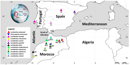 Figure 1. Map of sampling localities of cyprinoid fish hosts in Northwest Africa (Morocco) and the Iberian Peninsula (Portugal and Spain). Map was created using the simple Mapper tool (www.simplemapper.com, accessed on 30 April 2023) and manually edited (see details in Table 1).