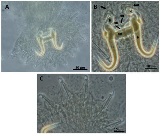 Figure 2. Micrographs showing the unusual morphology of haptoral sclerotized structures recovered in Gyrodactylus specimens found to parasitize Northwest African cyprinid fish hosts across the Strait of Gibraltar. Micrographs were taken from a parasite specimen of Gyrodactylus moroccensis sp. nov. parasitizing the Rabat barbel Luciobarbus rabatensis Doadrio, Perea & Yahyaoui, 2015 (type–host). (A) Haptoral part, general view; (B) detailed morphology of hamuli (H), dorsal (DB) and ventral bars (VB); (C) detailed morphology of marginal hooks.