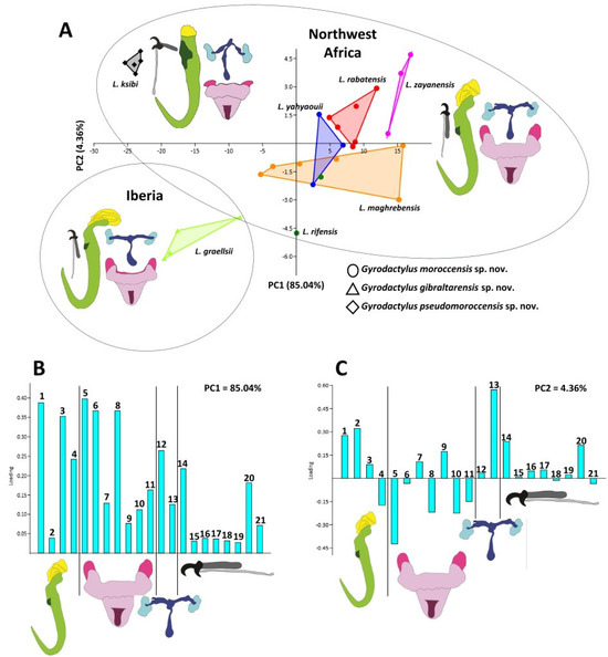 Figure 6. Principal component analysis (PCA) based on 21 morphological characters of the haptoral sclerotized structures supporting the taxonomical differentiation of Gyrodactylus gibraltarensis sp. nov. from Iberia, Gyrodactylus moroccensis sp. nov., and Gyrodactylus pseudomoroccensis sp. nov. from Northwest Africa. (A) Plot of the PCA (two first axes) illustrating the distribution of Gyrodactylus gibraltarensis sp. nov. specimens (triangles), Gyrodactylus moroccensis sp. nov. (circles), and Gyrodactylus pseudomoroccensis sp. nov. (diamonds). Histograms of the factor loading of the characters contributing most to the variation along PC1 (B) and PC2 (C). Characters 1–4 are for hamuli, 5–11 are for the ventral bar, 12–13 are for the dorsal bar, and 14–21 are for marginal hooks: (1) anchor total length; (2) outer root length; (3) shaft length; (4) point length; (5) ventral bar total length; (6) ventral bar total width; (7) lateral processes length; (8) distance between lateral processes; (9) median width; (10) membrane length; (11) membrane width; (12) dorsal bar total length; (13) dorsal bar width at midpoint; (14) marginal hooks total length; (15) sickle length to shaft attachment; (16) sickle proximal width; (17) sickle distal width; (18) shaft length of sickle; (19) point length of sickle; (20) handle length; (21) filament loop length (terminology follows refs. [15,18]).