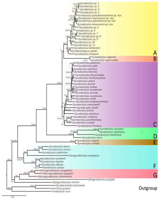 Figure 7. Maximum likelihood (ML) phylogram of Gyrodactylus spp. parasitizing distinct fish hosts worldwide based on sequences of the V4 region of the 18S rDNA (457 bp) and ITS regions (838 bp). Values above branches indicate bootstrap support (BS) from ML and posterior probabilities (PP) from BI analyses. Values below 60 (ML) and 0.80 (BI) are shown as dashes. Clades (AG) refer to different Gyrodactylus spp. lineages.