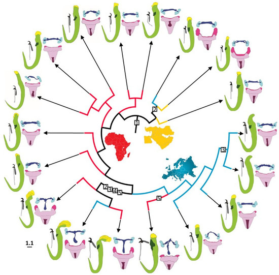 Figure 8. Schematic representation of the haptoral sclerotized structures of Gyrodactylus spp. parasitizing Eurasian and West Mediterranean species that formed clade A in Figure 7 along the ML phylogram obtained using sequences of the 18S rDNA and ITS regions. The geographical (continental) distribution is mapped onto the ML tree. The drawings were edited using Adobe Illustrator CS6 (see methodology above). A specimen of G. katharineri was collected from B. barbus from France (see [97]). The specimens are not uniformly scaled. Yellow: Asia, including the Middle East; blue: Europe; red: Africa. Character 1: median ridge in the ventral bar; character 2: long lateral processes of the ventral bar; character 3: twisted inner roots of the hamuli; character 4: accessory portion of the hamuli, i.e., the membranous patch-like structure surrounding the inner roots; character 5: T-shaped dorsal bar.