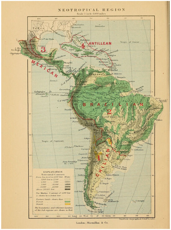 Neotropical region map including subregions according to Alfred Russel Wallace, The Geographical Distribution of Animals (S718: 1876). Source: web, licensable Figure: 1. Chilian subregion; 2. Brazilian subregion; 3. Mexican subregion; 4. Antillean subregion.