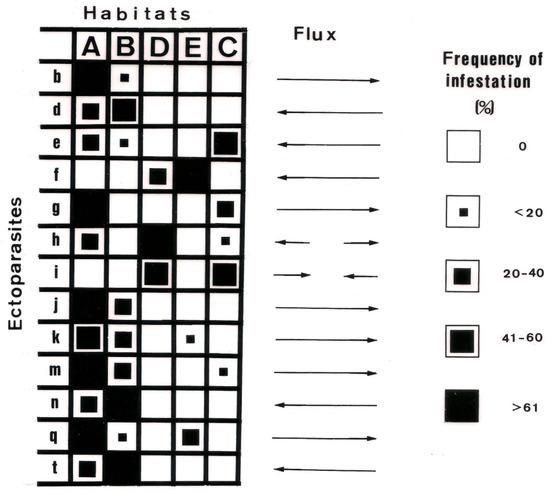 Interchange of ectoparasites between habitats on the Maracá Island, Roraima, Brazil, obtained from the frequencies of infestation on hosts in the respective habitats. A: dry savanna; B: forest; C: seasonally flooded savanna; D: ecological station; E: water tank area; b–t: species of mites, lice, and fleas infesting mammals. Source: Linardi and Botelho [95] (reproduced with permission from Research Trends).