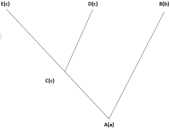 Manter’s parasitophyletic rule: flea species (small letters); host species (capital letters). Hosts D and E form a monophyletic group, sharing the same flea species c.