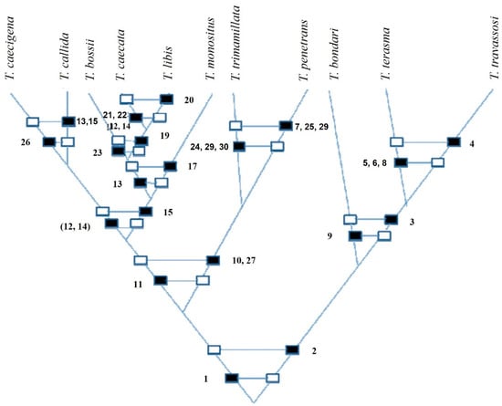 Cladogram of some species of Tunga based on groups of hosts used as characters (numbers 1 to 30). White bars indicate plesiomorphic states of the character. Black bars indicate apomorphic states. Heterobathmy of characters with synapomorphies and autapomorphies can be seen in this scheme of argumentation. Numbers in parentheses indicate homoplasies. Source: de Avelar [103].