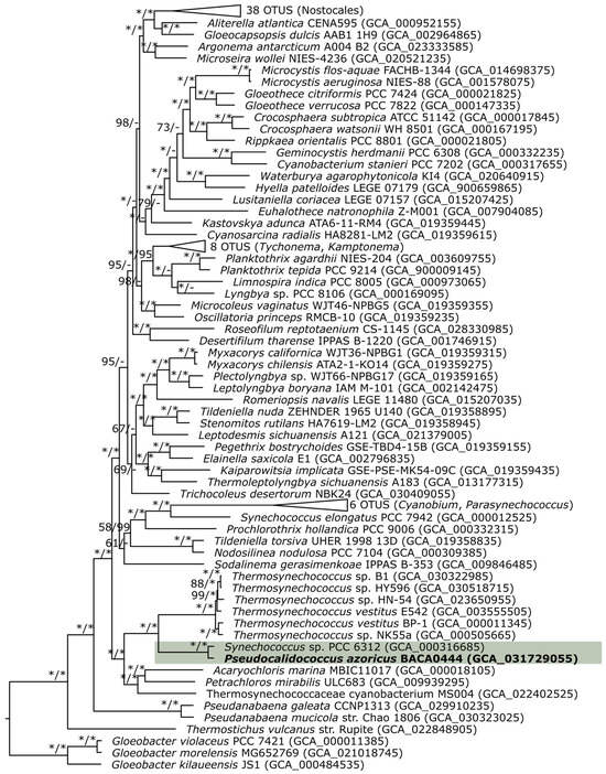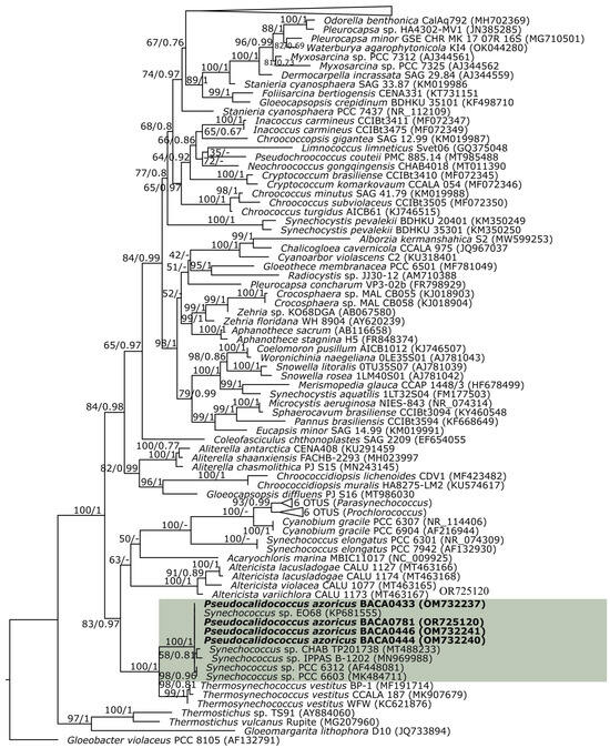 The four Azorean strains were grouped together with other Synechococcus sp. strains (EO68, CHAB TP201738, IPPAS B-1202, PCC 6312, and PCC 6603) in the 16S rRNA phylogenetic analysis (Figure 2), near Thermosynechococcus, with strong support (100 ML, 1 BI), suggesting the position of Pseudocalidococcus in the Thermosynechococcaceae. Furthermore, the Synechococcus sp. strains positioned in the cluster of Pseudocalidococcus azoricus are genetically closely related and must all belong to the genus Pseudocalidococcus. Therefore, Pseudocalidococcus has a wide geographical distribution, being present at least in the United States of America (a freshwater pond in California, PCC 6603 strain) and Kazakhstan (Issyk Lake, IPPAS B-1202 strain), besides the Azores archipelago.