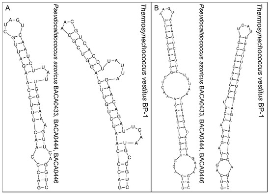 The 16S–23S rRNA ITS secondary structures of the D1-D1′ (A) and Box-B (B) region of Pseudocalidococcus azoricus BACA0444 and the closest phylogenetic species of Thermosynechococcus vestitus BP-1.