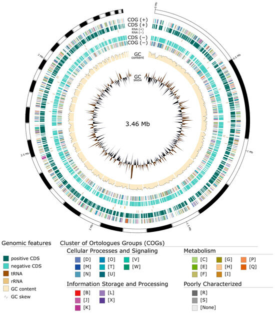 The produced genome is of high quality, with 34 contigs, a size of 3,463,985 base pairs (Figure 4), and a GC content of 48.7%. Quality control showed a 99.53% completeness and a 0.12% contamination according to CheckM v1.2.2, a 99.8% completeness and a 0.0% contamination according to CheckM2 v1.0.2, and a 98.4% completeness according to BUSCO v5.5.0. Assembly data and annotation statistics to the closest phylogenetic genera are presented in Table 3.