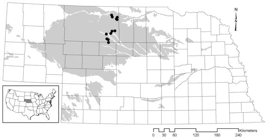 Location of study sites (dots) in eastern Cherry and northern Thomas counties in Nebraska, USA. The Sandhills ecoregion is shaded.