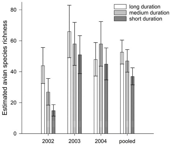 Estimates of bird community species richness, accounting for incomplete detectability, in three grazing systems (long, medium, and short duration) on private lands in the Nebraska Sandhills, 2002–2004 and the means pooled across years. Error bars show 95% confidence intervals.