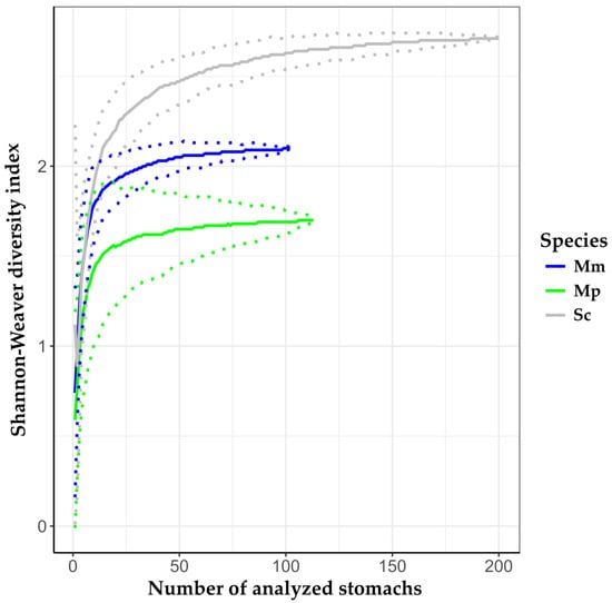 To investigate whether a sufficient number of stomachs were analyzed, cumulative diversity curves were made using the lowest taxonomic level of the prey, separately for each species. Using EstimateS software (version 9.1) [56], the order in which the stomachs were analyzed was randomized 500 times, and the Shannon–Weaver index (H′, mean ± standard deviation; see below for its calculation), a proxy for diet diversity, was plotted against the total number of non-empty stomachs [57]. The presence of an asymptote in the curve indicates that enough stomachs were analyzed [58].
