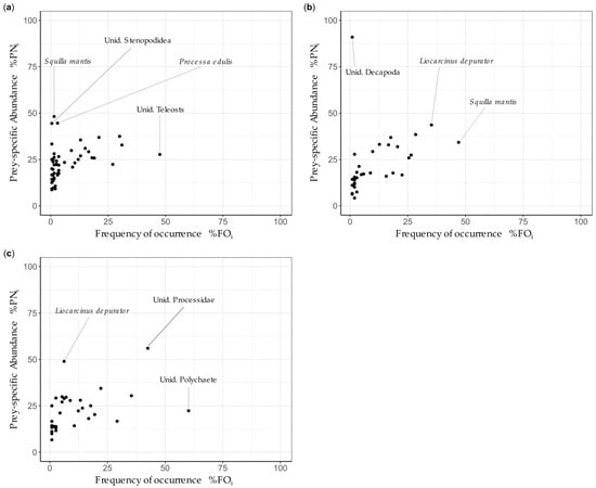 Feeding strategy of (a) S. canicula, (b) M. mustelus, and (c) M. punctulatus represented as the prey-specific abundance (%PN) of every prey category identified in the diet plotted against its percent frequency of occurrence (%FOi). Each black dot corresponds to a different prey category identified in the diet of the species.