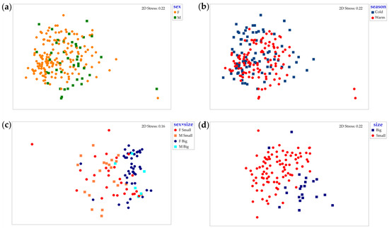 Non-metric multidimensional scaling (nMDS) ordination of dietary composition by biomass of (a) sexes (females, F: orange ●; males, M: green ■) and (b) seasons in S. canicula (cold season, Cold: blue ■; warm season, Warm: red ●), (c) the combination of the levels of sex and size factors in M. mustelus (small females, F Small: red ●; small males, M Small: orange ■; big females, F Big: blue ●; big males, M Big: light blue ■), and (d) sizes in M. punctulatus (small animals, Small: red ●; big animals, Big: dark blue ■).