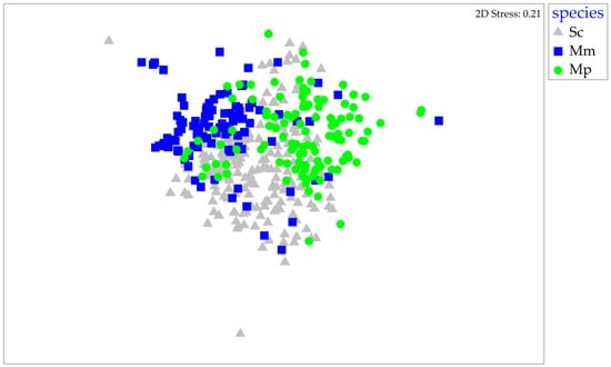 A permutational multivariate analysis of variance (PERMANOVA), including sex, size, season, and their interaction, was used to highlight any intraspecific differences in diet [5,71,72,73,74]. The analysis was based on the Bray–Curtis similarity matrix obtained from the square root transformation of the prey biomass data. A non-metric multidimensional scaling (nMDS) was performed to graphically represent the dissimilarity between the different groups [5]. Prior to the analysis, prey categories with %FOi lower than 5% were aggregated in larger categories according to taxonomic and ecological criteria, with the exclusion of prey belonging to species of commercial values or showing high abundance in the diet of one of the species (Table S1). A PERMANOVA test including the factor species (three levels) was used to investigate any interspecific differences in diet composition. To identify differences between species pairs, pairwise PERMANOVA comparisons were performed. A similarity percentage (SIMPER) analysis based on square root transformed biomass data was used to identify the percent dissimilarities between the groups and the percent contribution of the different prey categories to the observed differences [5,71,72,73,74].