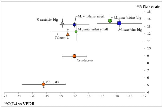 Bidimensional plot of carbon (δ13C) and nitrogen (δ15N) stable isotopes ratios (mean ± standard deviation) for the three shark species categorized for size (S. canicula: grey ▲; M. mustelus: blue ■; M. punctulatus: green ●) and for their main prey categories (Teleost: orange ▲; Crustacean: orange ▲; Mollusks: orange ▲). Data are reported as the isotope ratio of the sample relative to the standards (international standard Vienna Pee Dee Belemnite (VPDB) for C and atmospheric nitrogen for N).