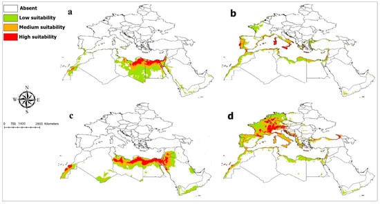 Current potential distribution of five species of the family Megachilidae: (a) Chalicodoma flavipes; (b) Chalicodoma sicula; (c) Megachile minutissima; (d) Osmia submicans.