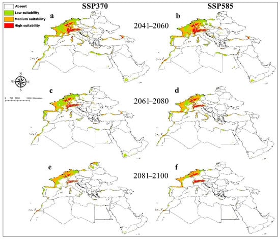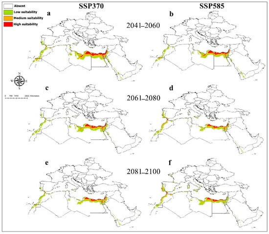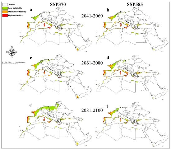 Future potential distribution of Chalicodoma sicula based on future climatic conditions: (a,b) represent the period (2041–2060); (c,d) represent the period (2061–2080); (e,f) represent the period (2081–2100).