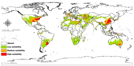 Current potential distribution of Coelioxys coturnix based on present-day climatic conditions.