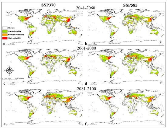 Future potential distribution of Osmia submicans based on future climatic conditions: (a,b) represent the period (2041–2060); (c,d) represent the period (2061–2080); (e,f) represent the period (2081–2100).