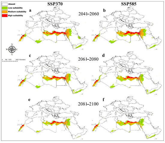 Future potential distribution of Chalicodoma flavipes based on future climatic conditions: (a,b) represent the period (2041–2060); (c,d) represent the period (2061–2080); (e,f) represent the period (2081–2100).