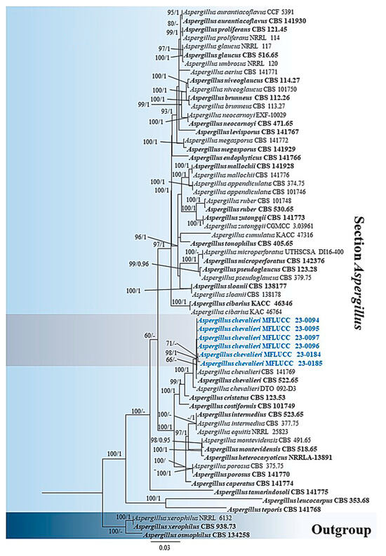 Phylogenetic analyses were performed using two separate datasets, one for Aspergillus section Aspergillus and the other for Aspergillus section Nigri. Maximum likelihood and Bayesian phylogenetic trees from combined DNA sequences of BenA, CaM, ITS, and RPB2 gene regions had the same topology. The sequence dataset of Aspergillus section Aspergillus consists of 62 taxa (Table 3). Our six isolates (MFLUCC 23-0094, MFLUCC 23-0095, MFLUCC 23-0096, MFLUCC 23-0097, MFLUCC 23-0184, and MFLUCC 23-0185) are clustered with A. chevalieri with 100% MLBS/1.00 BYPP support (Figure 1). We, therefore, identify these strains as A. chevalieri (Table 5).