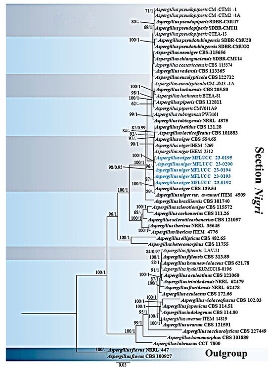 The sequence dataset of Aspergillus section Nigri consists of 51 taxa (Table 4). Our five isolates (MFLUCC 23-0192, MFLUCC 23-0193, MFLUCC 23-0194, MFLUCC 23-0195, and MFLUCC 23-0200) clustered with A. niger with 100% MLBS/1.00 BYPP support (Figure 2). We, therefore, identify these strains as A. niger (Table 5).