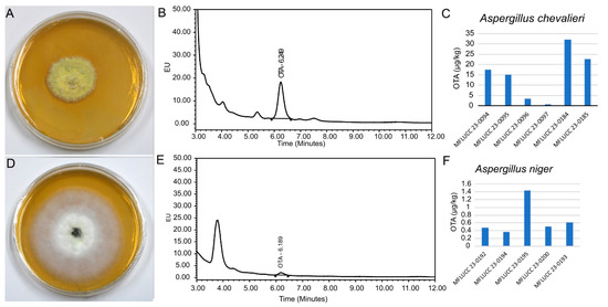 Analysis of OTA production by isolates of A. chevalieri and A. niger on YES at 25 °C for 14 days. (A,D) A. chevalieri (MFLUCC 23-0184) isolated from bael fruit and A. niger isolates from green tea (MFLUCC 23-0195), respectively. (B,E) UV absorbance traces of extracts from MFLUCC 23-0184 and MFLUCC 23-0195. (C,F) Amount of OTA production by different isolates of A. chevalieri and A. niger.