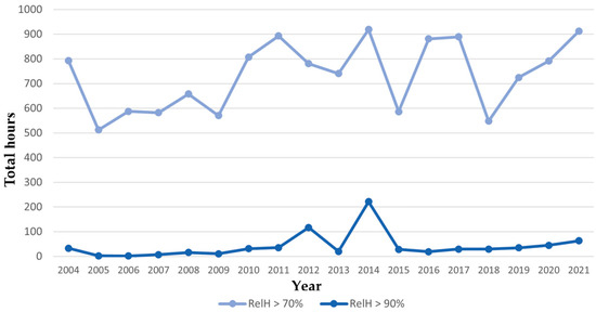 Graph of historical (2004–2021) total hours in June, July, and August against relative humidity obtained from the LEMG station (ASOS network 36.67 N, 4.49 W) above 70% (comfort point) and 90% (condensation point).