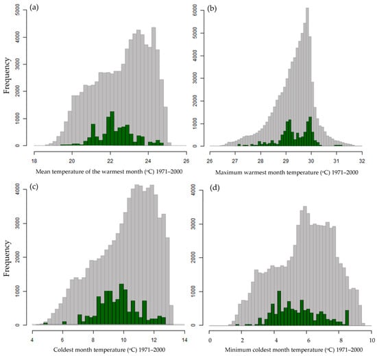 Ecological profiles of thermometric variables of Buxus balearica during the period of 1971–2000: (a) tmc (mean temperature of the warmest month), (b) tmmc (maximum warmest month temperature), (c) tmf (coldest month temperature), and (d) tmmf (minimum coldest month temperature). The gray bars in the background represent the mean values of the territory, and the green bars represent the mean values of the species.