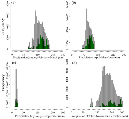 Ecological profiles of pluviometric variables of Buxus balearica during the period of 1971–2000. (a) PT01 (mean precipitation of the first quarter), (b) PT02 (mean precipitation of the second quarter (c) PT03 (mean precipitation of the third quarter), and (d) PT04 (Mean precipitation of the fourth quarter). The gray bars in the background represent the mean values of the territory, and the green bars represent the mean values of the species.