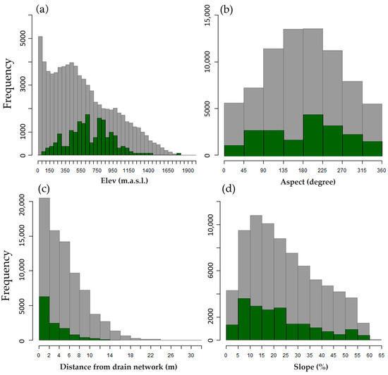 Ecological profiles of topographic variables of Buxus balearica during the period of 1971–2000. (a) MDT (elevation from the digital elevation model), (b) ORI (Aspect), (c) DIST (Euclidean distance from drainage network), and (d) SLP (slope). The gray bars in the background represent the mean values of the territory, and the green bars represent the mean values of the species.