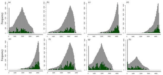 Ecological profiles of the insolation models of Buxus balearica during the period of 1971–2000. (a) MDI1 (insolation model between December–March), (b) MDI2 (insolation during spring equinox), (c) MDI3 (insolation model between March–June), (d) MDI4 (insolation model during summer solstice), (e) MDI5 (insolation model between June–September), (f) MDI6 (insolation model during autumn equinox), (g) MDI7 (insolation model between September–December), (h) MDI8 (insolation model during winter solstice). The gray bars in the background represent the mean values of the territory, and the green bars represent the mean values of the species.