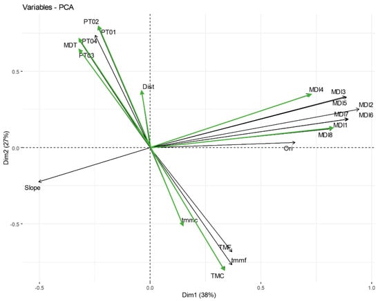 According to PCA analysis, component 1 explains 38% and comprises the variables of the insolation models, with the spring and autumn equinoxes contributing the greatest weight (Figure 6). In contrast, the variables MDI4 and MDI8 contribute 0.26 and 0.32, respectively, to the same component (Table 4). Component 2 groups in one direction the temperatures of the warmest month and the minimum temperatures of the coldest month and in another the precipitation from January to June with an accumulated variance of 27%. Component 3 only contributes 12% but absorbs the topographic variables (MDT and Dist), the precipitation from July to December (PT03 and PT04), the maximum temperatures of the warmest month (TMMC), and the mean of the coldest month (TMF).