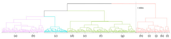Dendrogram of habitat heterogeneity of Buxus balearica in Andalusia using eight variables (PT01, PT03, TMC, TMMC, MDT, DIST, MDI4, and MDI8). Each color represents a subpopulation, and it is correlated to the Figure 8 representation. (a) Cómpeta, (b) Chillar river basin, (c) Lentejí > 600 m, (d) Lentejí < 400 m, (e) Frigiliana, South Cómpeta, (f) South Guájares, (g) North Guájares, (h) Middle Nerja, (i) Cerro Gordo, Arroyo de la Miel, (j) Low Chillar, (k) Guadalfeo, Molvízar, and (l) Almería.