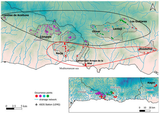 The habitat of B. balearica in the Southern Spanish Mediterranean suggests the existence of two very different sets of localities: those of the lower thermo-Mediterranean floor, very thermal, frost-free, with average temperatures in the coldest month above 11 °C, and those of the upper thermo- and meso-Mediterranean with temperatures that even drop to 7 °C. Indeed, within the coastal and thermal sub-population, an eastern nucleus (Guadalfeo-Molvízar) can be clearly distinguished from two others, a central one (Cantarriján and Arroyo de la Miel) and a more westerly one (lower Nerja). Within the mountain sub-population, several nuclei can be distinguished: (a) the nucleus of Otívar, probably characterized by the high slopes (the boxwoods are on vertical walls); (b) the upper eastern nucleus of Guájares-Cázulas; (c) the central nucleus of the upper valley of the river Chíllar; (d) the western nucleus of the valleys above Cómpeta, including that of Cázulas; and (e) the small nucleus of Canillas de Aceituno (Figure 8).