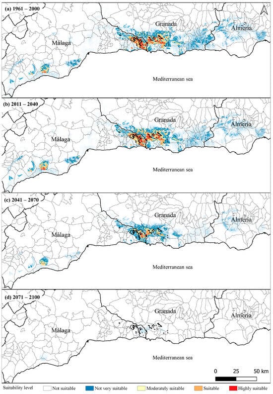 In the 1961–2000 scenario, the potential distribution extends west of the current central core through the Malacitan mountains. The 2011–2040 scenario shows a slight variation, despite demographic regression in current populations. The 2040–2070 scenario reduces the density of presence in its central core in Málaga–Granada, and its potentiality decreases more drastically in the western potential core. In the 2070–2100 scenario, B. balearica landscapes disappear completely from their western and eastern potential cores, while their presence in the current central core becomes anecdotal. The species and its landscapes disappeared almost entirely from the Iberian Peninsula.