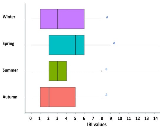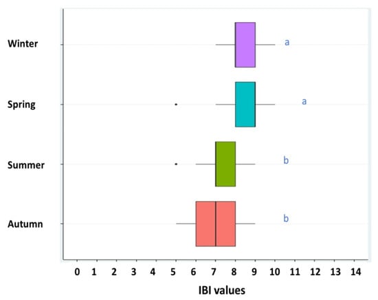 In all disturbed sites, no difference in IBI values between seasons was observed (Figure 1 and Figure S2, Table 5), whereas significant differences between seasons were observed in preserved sites (Figure 2, Table S3). Pairwise analysis showed that IBI values measured in winter and spring were significantly higher than IBI values in summer or autumn (Figure 2, Table S3), suggesting a difference between cold and warm semesters that is confirmed by the Wilcoxon test (Figure S3, Table 4 with p < 0.0001).