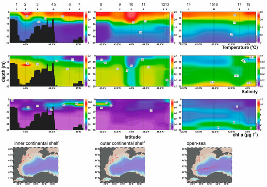 Vertical profiles of physical parameters (temperature, salinity) and chl-a in the inner, the outer continental shelf, and the open sea of the study area.