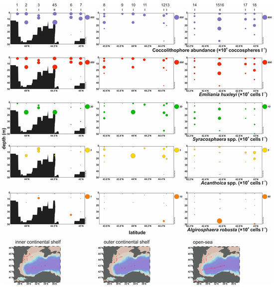 Acanthoica spp. were presented mostly in the surface layer (up to 30 m depth) in all three transects (Table 1; Figure 3), with maximum frequencies below 3% and abundances up to 3 × 104 cells L−1 (St 10, 15 m depth). Algirosphaera robusta represented 0% to 69% (average = 4%) of the total assemblage and reached a maximum abundance of 79 × 104 cells L−1 (St 15, 45 m depth). This species was rare in shallow waters and was mainly restricted to deeper layers below 30 m depth (Table 1; Figure 3).