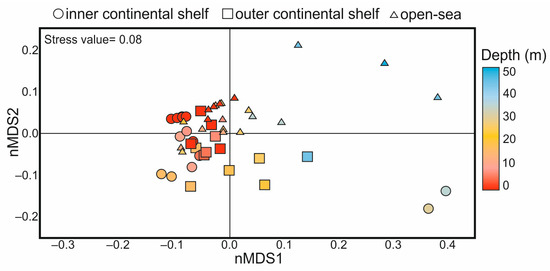 Statistical analysis was performed using the PAST (PAleontological STatistics Version 4.14) software (Natural History Museum, University of Oslo, Norway) [48]. Before analysis, the coccolithophore abundances and environmental data were logarithmically transformed to reduce the magnitude difference between the variables. Non-metric multidimensional scaling (nMDS) based on Bray–Curtis dissimilarity was used to visualize the spatial and vertical distribution patterns in the coccolithophore community structure. A stress value of less than 0.2 indicates a reasonable ordination [49]. Significant differences among the coccolithophore assemblages in different sub-regions (inner, outer continental shelf, and open sea) and sampling depths were tested using the one-way analysis of similarity (ANOSIM, 9999 permutations). In addition, the simple nonparametric Spearman’s ρ correlation was carried out to determine possible relationships between the coccolithophore taxa and environmental variables (temperature, salinity, and chlorophyll fluorescence).