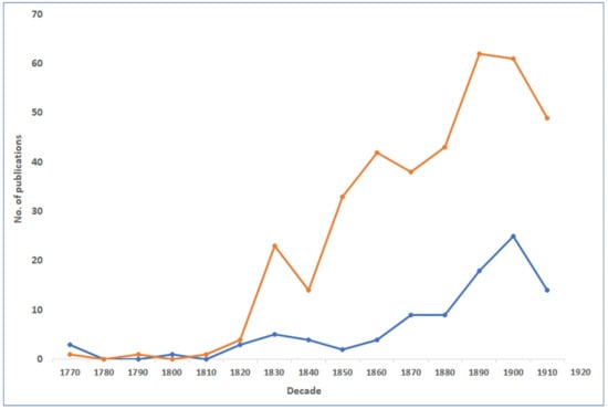 The increase in publications on Dreissena polymorpha published between 1770 and 1920 in Russia (blue line) and Western and Central Europe (orange line). Each point corresponds to the total number of publications per decade. The primary data were obtained from Limanova [,].