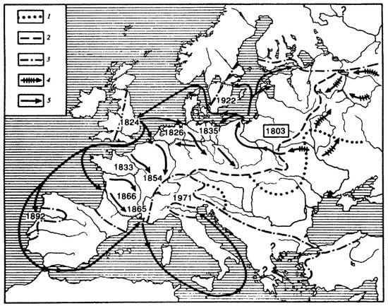 A map illustrating the process of D. polymorpha dispersal through Europe in the 19–20th centuries. 1—The Early Holocene distribution; 2—the range of D. polymorpha by the start of the Anthropocene; 3—the range of D. polymorpha in the early 1990s; 4—routes of dispersal prior to 1803; and 5—routes of dispersal after 1803. The numbers correspond to the dates of the first finds of the zebra mussels in various countries. Modified from Starobogatov and Andreeva [].