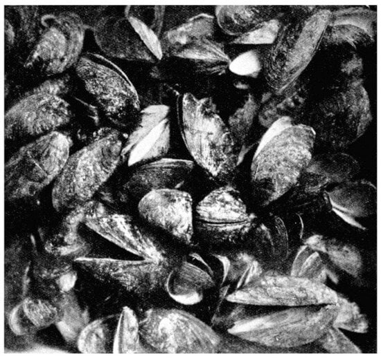 A photograph, taken in 1912, showing a mass of Dreissena individuals removed from an unfiltered water main at Hampton-on-Thames, England. From Kirkpatrick [].