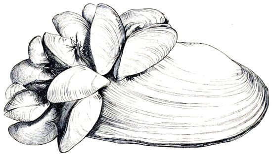 It seems that the ecological peculiarities of D. polymorpha, especially its biotic interactions with other organisms of the biocoenoses, were a subject that German naturalists were a little more interested in than their colleagues in the UK, France, and Russia. The German literature of the discussed period is filled with such observations, directly relating to the invasion ecology of the zebra mussel, including its movement and mechanisms of migration. Numerous observational notes of this kind appeared in popular German scientific periodicals such as Aus der Heimat (From the Homeland), Der Zoologische Garten (The Zoo), Blätter für Aquarien- und Terrarien-Kunde (A Leaflet of Aquarium and Terrarium Science), etc. Struck [,] observed that D. polymorpha may use the bodies of motile animals (river crayfish) as a substratum for their settlement; this can represent a means for the zoochoric dispersal of the mollusk. The same author published a brief list of freshwater fish feeding on Dreissena in Germany []. The interactions between the zebra mussel and the native species of large unionid mussels were also a subject of observation and illustration (Figure 4). Frenzel [] determined the suite of aquatic organisms associated with colonies of Dreissena; it includes larvae of various insects, the water louse, and gammarids as well as leeches and diatom algae (Bacillariaceae).