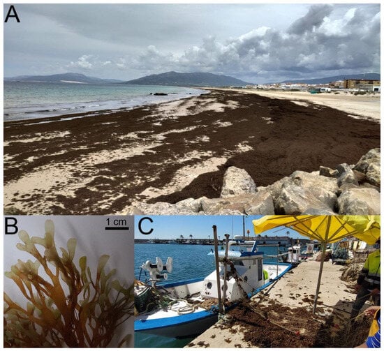 In 2015, the arrival of a new alien and highly invasive alga, Rugulopteryx okamurae (E.Y. Dawson), to the SoG marked an unprecedented milestone in North African and European marine ecosystems [,,,,,,]. From 2015 to date, R. okamurae has colonised most of the infralittoral rocky bottoms (5–30 m deep) of the SoG and is currently expanding towards adjacent Atlantic and Mediterranean coastal areas, including the southern and eastern Iberian Peninsula [,], southern Portugal [], north Africa [] and some Macaronesian Islands (e.g., Madeira, Azores Islands) [,], where it is currently modifying the infralittoral habitats and associated communities. In Europe, this alga was firstly detected in 2002 in the Thau lagoon (southern France), but it became highly dominant along the Marseille coasts during 2018–2020 [,]. The great invasive capacity of R. okamurae is enhanced by its dispersion pathway (through unattached thalli–free drifted thalli), prolific vegetative reproduction, and high survival in adverse environmental conditions [,,]. Moreover, the very high productivity of this alga is transported via drifted thalli that can accumulate on beaches, rocks, or other hard substrates, and may generate a significant impact on human socioeconomic activities, tourism, and, of course, on marine habitats, not just where the algae develop but also in adjacent coastal locations (Figure 1). In the case of the invasion of R. okamurae, its high vegetative growth can sometimes lead to the algae covering 80–100% of the infralittoral and shallow circalittoral bottoms of the SoG and the Alboran Sea, which unfortunately results in (1) a regression of many native algae and invertebrate species and (2) the reduction in the typical benthic heterogeneity of infralittoral rocky coasts [,,]. Moreover, large amounts of detached thalli can be transported by the currents (drifted thalli) not just to the shores but also to deep areas, where they can cause a negative impact on some fragile habitat-forming species (e.g., the bamboo coral Isidella elongata) [].