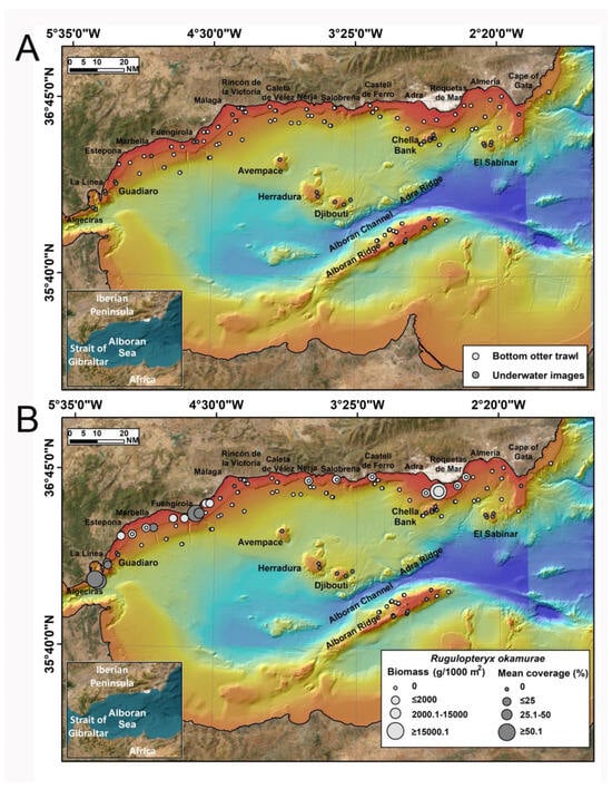 This study documents for the first time the massive presence of drifted R. okamurae thalli in the deep circalittoral and bathyal bottoms of the northern SoG and the Alboran Sea. The drifted thalli seem to be transported and dispersed by bottom currents as already documented in the nearby Gulf of Cádiz []. In this new study, the potential impact that the drifted thalli may have on different habitat-structuring/forming species of circalittoral and bathyal habitats has been based on the coverage–entanglement of the drifted thalli on those sessile organisms. The main aims of the present study are (1) to detect and quantify the accumulations of drifted thalli of R. okamurae on the shelf and slope of the northern SoG and the Alboran Sea and (2) to study the interaction of drifted thalli of R. okamurae with habitat-structuring/forming species of circalittoral and bathyal bottoms in this area of transition between the Atlantic Ocean and the Mediterranean Sea. The starting hypothesis is that the drifted thalli may be abundant in deepareas close to infralittoral areas colonised by this alga, and that the coverage–entanglement by the drifted thalli will be higher in large and three-dimensionally complex organisms. The importance of the present study is to document the potential impact that this new biological threat can generate not only in infralittoral habitats, but also in circalittoral and bathyal habitats to undertake rapid actions that may serve to improve knowledge of those deep-sea areas and species mostly affected by this invasive alga and/or implement actions for documenting and mitigating this impact in the near future.