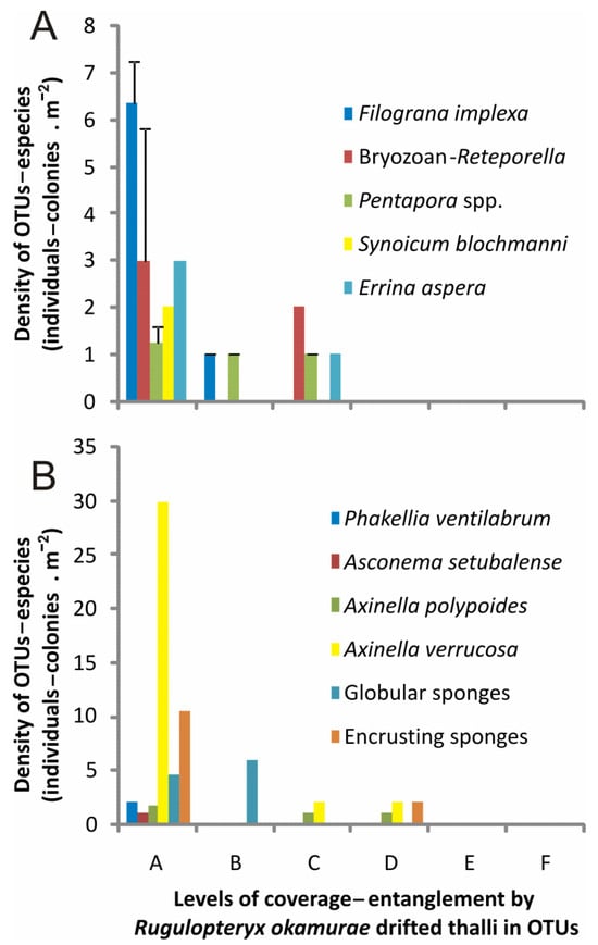 Mean density (+standard deviation) of different (A) hydrozoan, polychaete, bryozoan, and ascidian as well as (B) sponge species and OTUs with different levels of coverage–entanglement by drifted thalli of Rugulopteryx okamurae in circalittoral and bathyal bottoms of the northern Strait of Gibraltar and the Alboran Sea. A: absence of R. okamurae drifted thalli; B: presence of R. okamurae drifted thalli in the basal part of the individual–colony; C: presence of R. okamurae drifted thalli in less than 1/3 of the individual–colony; D: presence of R. okamurae drifted thalli between 1/3 and 2/3 of the individual–colony; E: presence of R. okamurae drifted thalli between 2/3 and 3/3 of the individual–colony; F: total coverage of R. okamurae drifted thalli in the individual–colony.