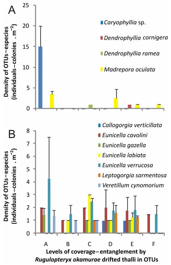 Mean density (+standard deviation) of different scleractinian (A) and octocoral (B) species with different levels of coverage–entanglement by drifted thalli of Rugulopteryx okamurae in circalittoral and bathyal bottoms of the northern Strait of Gibraltar and the Alboran Sea. A: absence of R. okamurae drifted thalli; B: presence of R. okamurae drifted thalli in the basal part of the individual–colony; C: presence of R. okamurae drifted thalli in less than 1/3 of the individual–colony; D: presence of R. okamurae drifted thalli between 1/3 and 2/3 of the individual–colony; E: presence of R. okamurae drifted thalli between 2/3 and 3/3 of the individual–colony; F: total coverage of R. okamurae drifted thalli in the individual–colony.