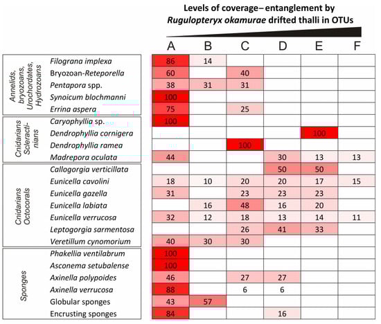Percentage of individuals–colonies of top-dominant OTUs and species in relation to different levels of coverage–entanglement by drifted thalli of Rugulopteryx okamurae in circalittoral and bathyal bottoms of the northern Strait of Gibraltar and the Alboran Sea. A: absence of R. okamurae drifted thalli; B: presence of R. okamurae drifted thalli in the basal part of the individual–colony; C: presence of R. okamurae drifted thalli in less than 1/3 of the individual–colony; D: presence of R. okamurae drifted thalli between 1/3 and 2/3 of the individual–colony; E: presence of R. okamurae drifted thalli between 2/3 and 3/3 of the individual–colony; F: total coverage of R. okamurae drifted thalli in the individual–colony. Intensity of the red colour indicates higher percentage values.
